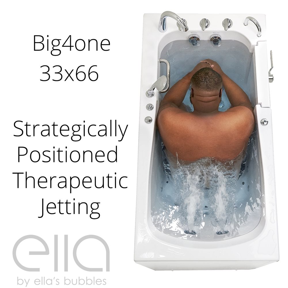 From the pioneers of Big4Two, the largest two seat walk-in bathtub, Ella’s Bubbles unveils the Big4One – perfect for big & tall bathers, up to 7 feet!. Please view the walk-in tub drawings and carefully verify that this model is the correct fit! While the industry offers deep walk-in bathtubs, Ella’s Big4One distinguishes itself by offering an extended seat.